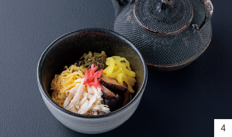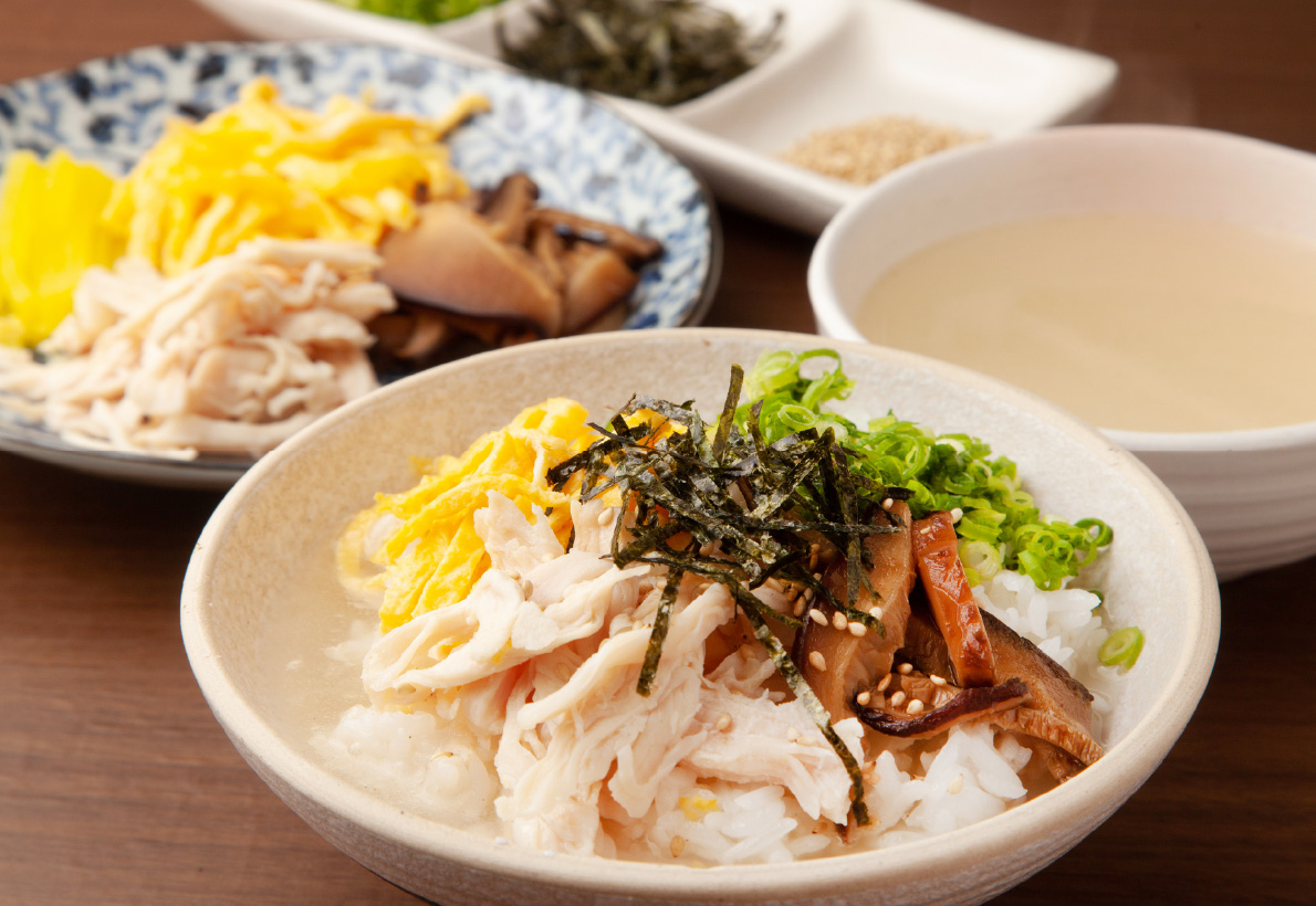 - 04. 【鶏飯】 炊きたての白ご飯の上に、鶏肉や錦糸卵などの具材をのせ、熱々の鶏出汁をかけていただくお茶漬け風の料理です。