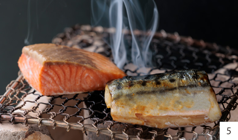 - 05. 【焼き魚】 熱々の七輪で、お好きな魚を自分好みに焼き上げるからこそ、香り立つ美味しさもひとしおです。