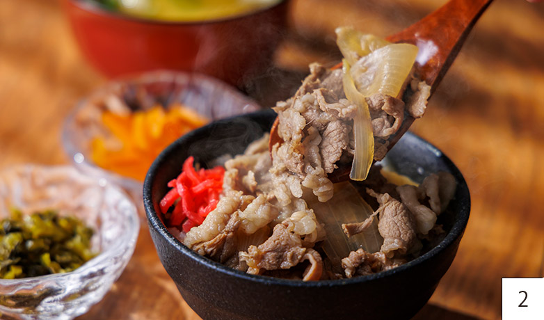 - 02. 【あか牛の牛丼】 熊本・阿蘇の雄大な自然の中で育った和牛・あか牛を贅沢に使用した牛丼です。