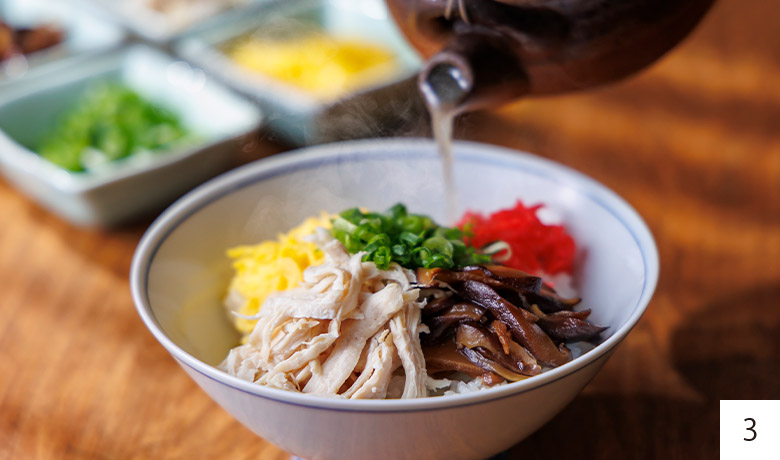 - 03. 【鶏飯】 炊きたての白ご飯の上に、鶏肉や錦糸卵などの具材をのせ、熱々の鶏出汁をかけていただくお茶漬け風の料理です。