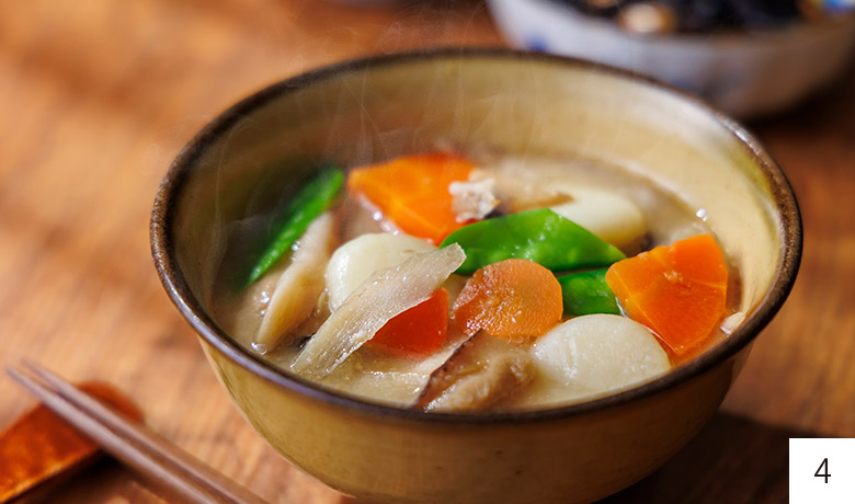 - 04. 【だご汁】 “だご”とは熊本弁で“団子”のこと。すいとん粉を使った平らなだんごが入った汁物です。