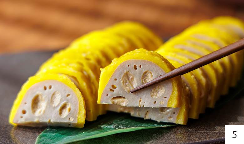 - 05. 【辛子蓮根】熊本を代表する郷土料理のひとつ。蓮根の穴に辛子味噌を詰め、衣をつけて揚げた、香ばしさと
