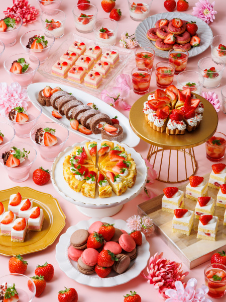 苺ショートケーキやタルト、ムースなど、みずみずしい苺を贅沢に使用したスイーツの数々がビュッフェ台を華やかに彩ります。