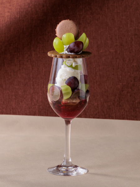 ぶどうパフェ ¥1,500(税込) みずみずしいマスカットとピオーネを贅沢に盛り込み、濃厚なジャージーアイスがその味わいを包み込みます。 香ばしいほうじ茶クッキーと清涼感あふれるマスカットゼリーが織りなす調和は、まさに秋だけの贅沢です。 |
